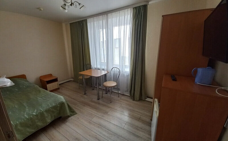Однокомнатный стандартный номер площадью 12 кв. м. В номере есть односпальная кровать, прикроватные тумбочки, стол, стулья, кресло, шкаф и зеркало. Также в номере предусмотрены набор посуды, ЖК-телевизор, холодильник и электрочайник. Санузел оснащён ванной/или душем. Из номера открывается вид на озеро или сад.