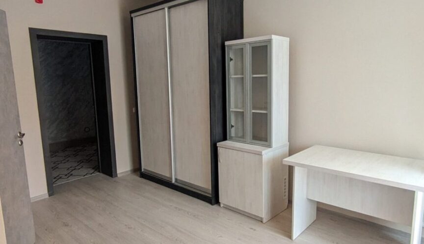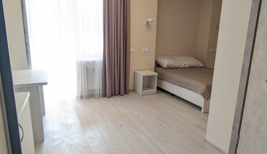 Семейный номер с одной комнатой. В номере есть дополнительное место — диван. Основные места — два. В номере есть необходимая мебель: вешалка, зеркало, двуспальная кровать с прикроватными тумбочками, стол со стульями и шкаф. Из оборудования в номере есть набор посуды, телевизор, холодильник и чайник.
